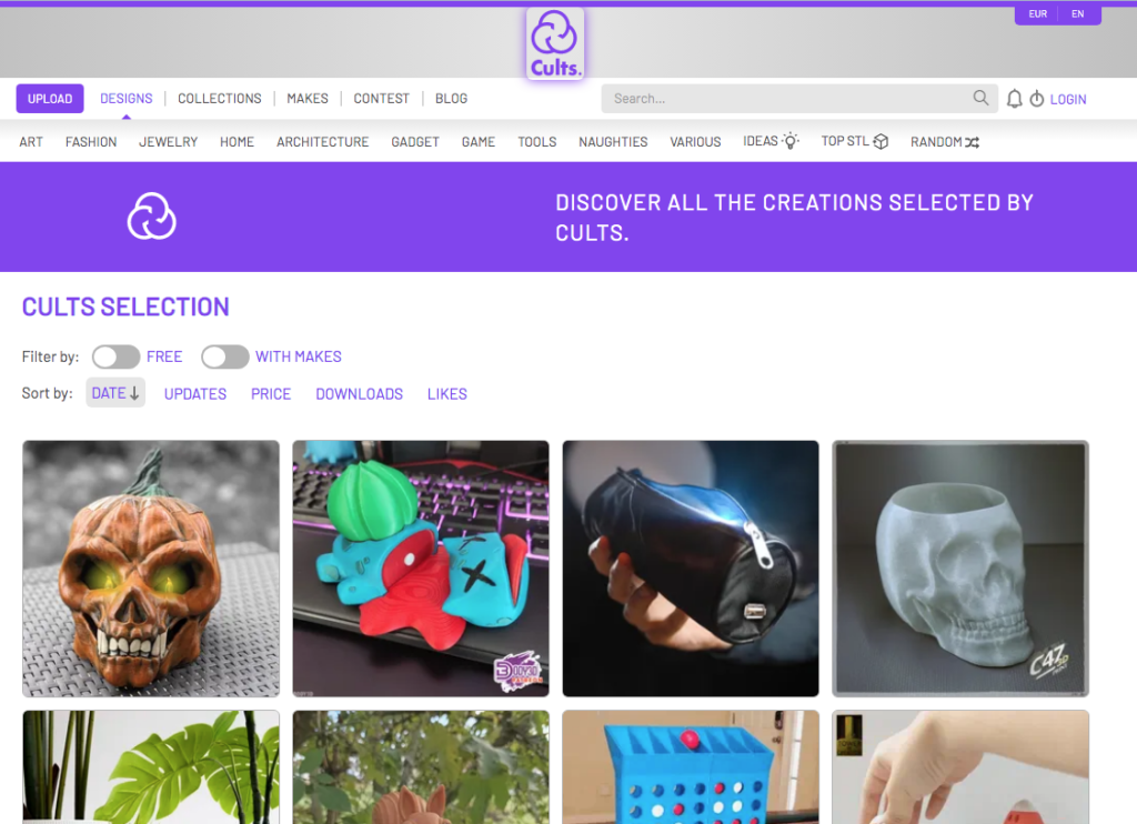 Cults – сайт французской компании. Здесь имеются как бесплатные, так и дорогостоящие модели. На всех работах, выполненных своими силами, можно неплохо заработать, таким образом этот контент на сайте приобрел неплохую популярность. За свои услуги, по предоставлению 3d-моделей, сайт, конечно, берет комиссию, но стоит учесть, что около 80% от цены каждой проданной 3d-модели, идет в кошелек автора. И даже если не планируете покупать эти продукты, вам стоит обязательно заглянуть на Cults, и посмотреть ассортимент сайта. Но не стоит смущаться названия самого сайта, поверьте, никаких культистов тут нет и не будет. А если перевернуть название этого сайта наоборот, то в переводе на наш русский язык, получится имя Святой Лука, который служит покровителем всех художников нашего мира.