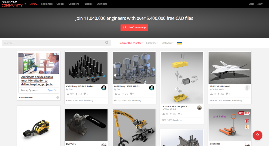 GrabCAD был основан в Эстонии в 2009 году в качестве торговой площадки, на которой инженеры могут найти работу, связанную с САПР. GrabCAD превратился в сообщество инженеров для обмена моделями САПР. Согласно сайту компании, GrabCAD был основан с целью объединения всех инструментов, необходимых инженерам для управления и обмена файлами САПР на одной платформе. В 2014 года GrabCAD был приобретен Stratasys. Сейчас данным источником может воспользоваться любой желающий, 3D-модели на различные темы представлены абсолютно бесплатно.