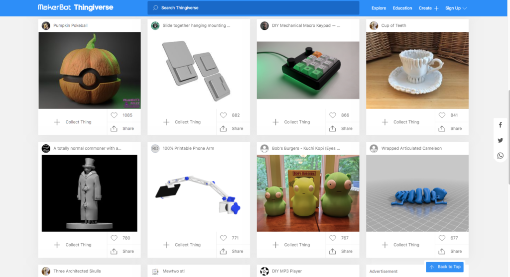 В последние годы эта компания стала работать под началом корпорации Stratasys, которая ориентируется больше на профессиональную публику аддитивного рынка. Но на работе площадки Thingiverse это никак не отразилось. Название платформы – это однозначно игра слов, которое переводится как «вселенная вещей». Эта площадка была и остается, одним из самых больших источников только бесплатных 3d-моделей для 3d-печати, и неизменно продолжает расти, налаживая контакты по всему миру. На данный момент Thingiverse предлагает потребителям более полутора миллионов 3d-моделей.