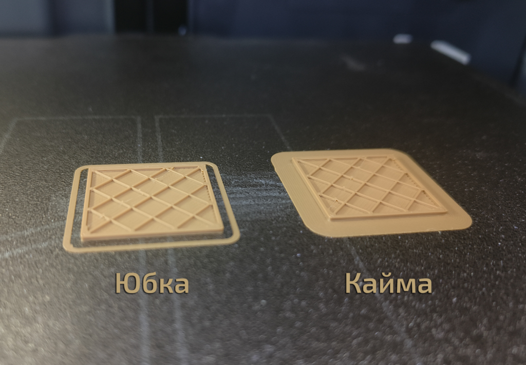 Кайма (Brim): Кайма — это тонкая полоса пластика, которая печатается вокруг основания модели, увеличивая площадь контакта. В отличие от подложки, кайма легко отделяется от модели.