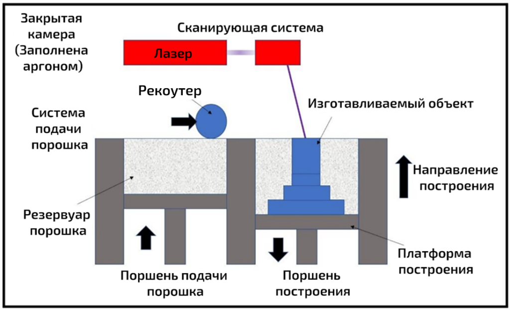 Система подачи и распределения порошка: отвечает за хранение, подачу и равномерное распределение металлического порошка по рабочей платформе. Обычно она состоит из резервуара, поршня, распределительного механизма (например, рекоутера или ролика) и системы управления.